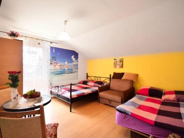 Pokój Czteroosobowy. This quadruple rooms special feature is the fireplace. The quadruple rooms kitchenette, which features a refrigerator and kitchenware, is available for cooking and storing food. The quadruple room provides a wardrobe, a barbecue, a balcony with garden views as well as a private bathroom featuring a shower. The unit offers 2 beds. Pokój Czteroosobowy - 5 osobowy. Powierzchnia pokoju ok.: 14 mkw. ;