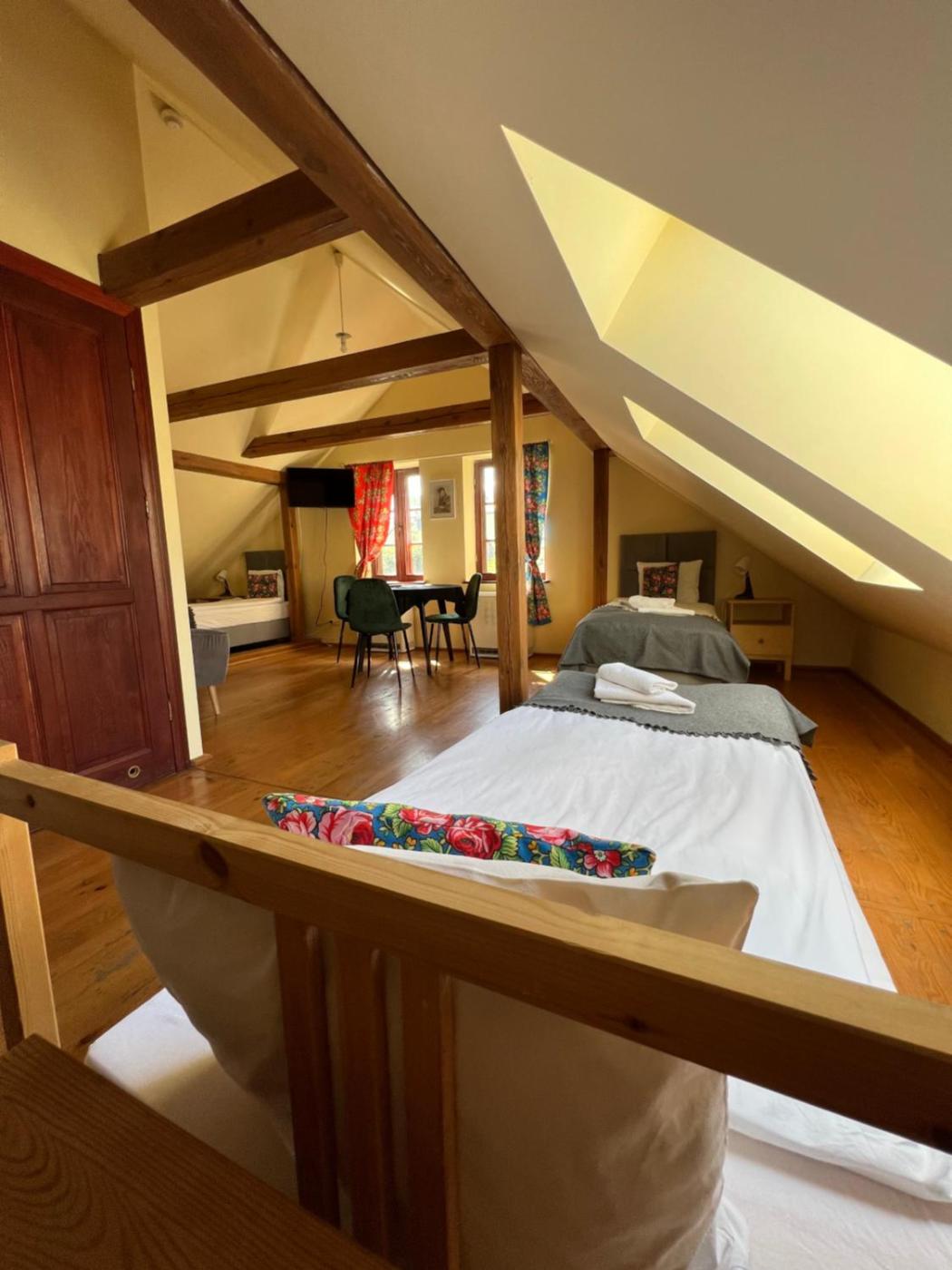 Pokój Trzyosobowy typu Comfort. The triple room provides parquet floors, heating, as well as a private bathroom featuring a shower. The triple rooms kitchen, which features a refrigerator and a microwave, is available for cooking and storing food. The spacious triple room offers a coffee machine, a dining area, a wardrobe, a sofa and a flat-screen TV with streaming services. The unit offers 3 beds. Pokój Trzyosobowy - 3 osobowy. Powierzchnia pokoju ok.: 40 mkw. ;